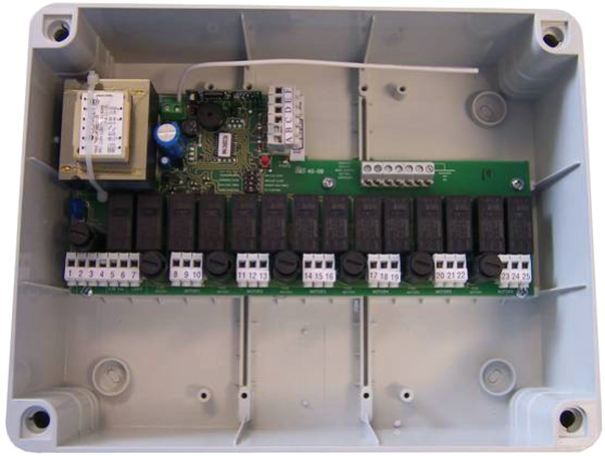 6 darab, egyenként 500W maximális teljesítményű 230Vac motorhoz, rádióvevővel együtt. Bemenetek: nyitás, leállítás, zárás gombok. Kimenetek: 230Vac, 24Vdc udvari fény. 230 VAC kimenet a motorok egyszeri vezérlésére, biztosítékkal védve és kollektív vezérlés esetén kikapcsolva
