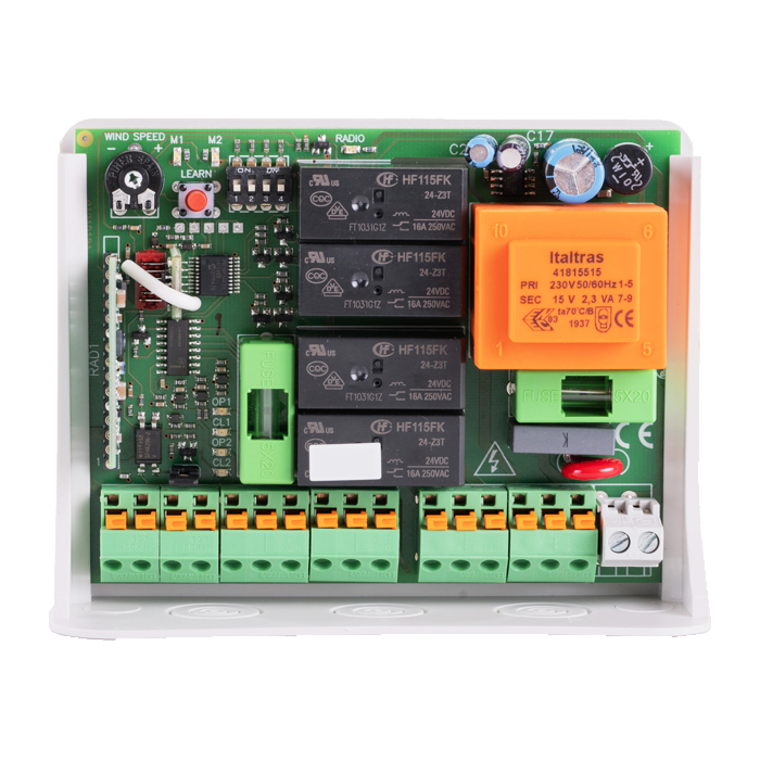 2 motoros vezérlőegység napernyőkhöz, redőnyökhöz, stb… szélmérő bemenettel.