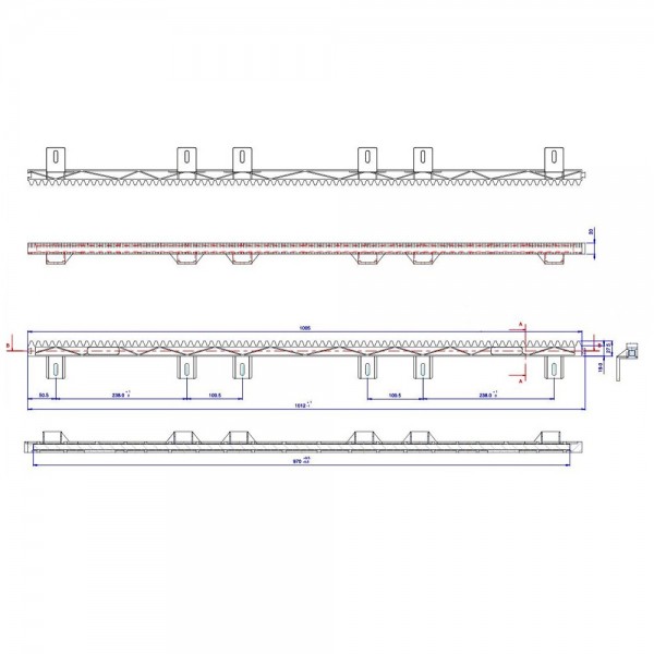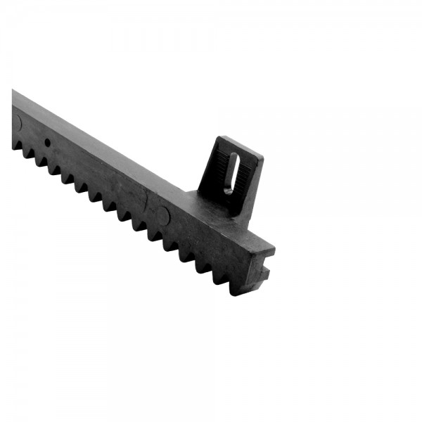 Fémszál erősítésű műanyag fogasléc, 1m-es, (fordított) felső füles kivitel, M4 modulméretű fogaskerékhez, max. 800kg kapusúlyig