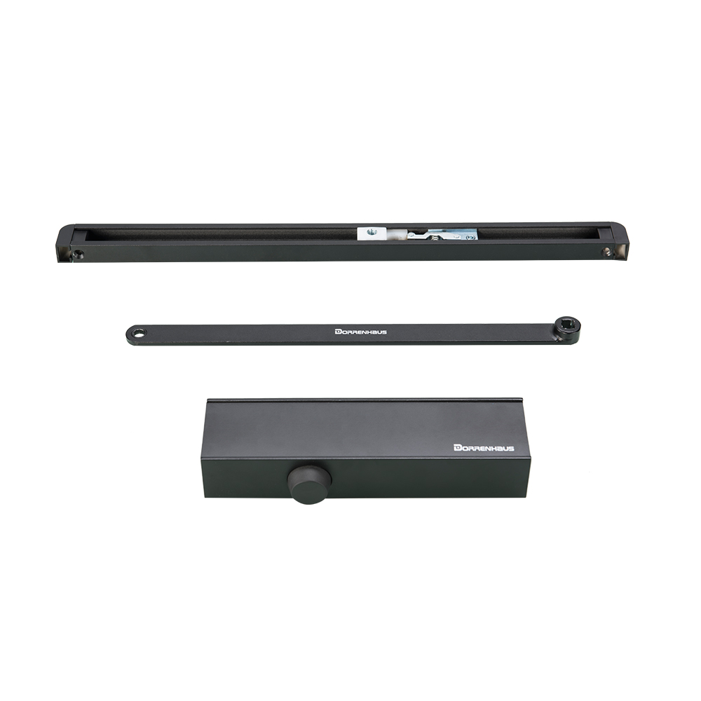 Dorrenhaus, CE minősített univerzális csúszósínes ajtóbehúzó kiakasztható sínnel. EN3 erősségű, max. 950 mm ajtószélességig és 40-65kg ajtósúlyig, 180°nyitási szög, két, külön tartományban állítható zárási sebesség (180-15°között és 15-0°között). Back Check funkció (nyitó irányú fék a kicsapódás ellen). Balos és jobbos ajtókhoz is. EN1154 (500.000 ciklus) és EN1634 (3 órás tűzállóság) szabvány által bevizsgált ajtócsukó., Tűz- és füstgátló ajtókhoz is! Alumínium ház, 233x60x42mm méret. Furattávolság: 50-50x45mm. Fekete színben.