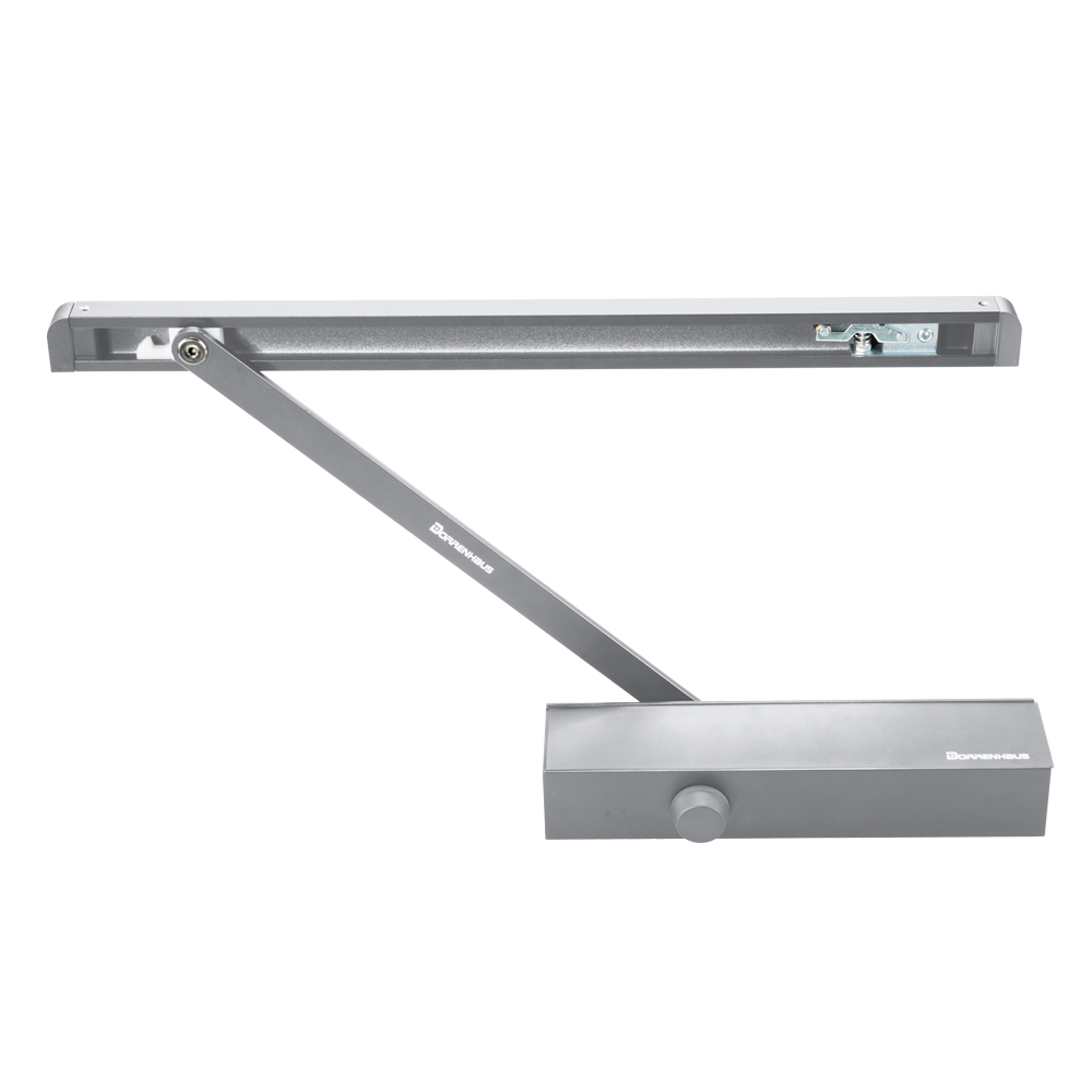 Dorrenhaus, CE minősített univerzális csúszósínes ajtóbehúzó kiakasztható sínnel. EN3 erősségű, max. 950 mm ajtószélességig és 40-65kg ajtósúlyig, 180°nyitási szög, két, külön tartományban állítható zárási sebesség (180-15°között és 15-0°között). Back Check funkció (nyitó irányú fék a kicsapódás ellen). Balos és jobbos ajtókhoz is. EN1154 (500.000 ciklus) és EN1634 (3 órás tűzállóság) szabvány által bevizsgált ajtócsukó., Tűz- és füstgátló ajtókhoz is! Alumínium ház, 233x60x42mm méret. Furattávolság: 50-50x45mm. Ezüst színben.