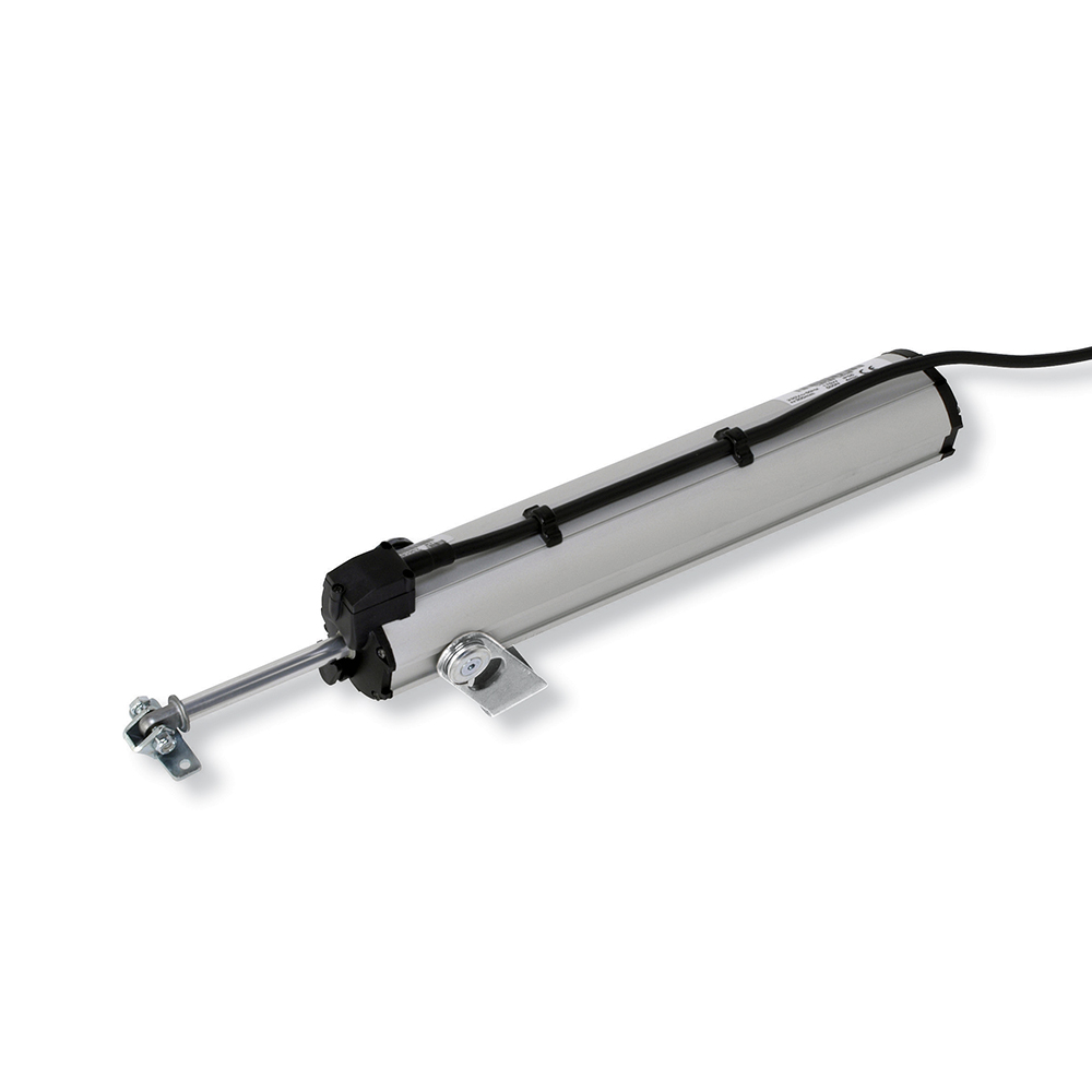 Csavarorsós ablakmozgató motor, emelkedő és tetőablakok, kupolák, lamellás ablakok és zsaluziák mozgatására. 300 mm-es löket, 500 N toló és húzóerő, eloxált ezüst alumínium házban. Mikrokapcsolós végálláskezelés nyitási és zárási funkcióban is, beépített hővédelem. A motortesten kétoldalt végigfutó konzol. Védelmi fokozat IP55.