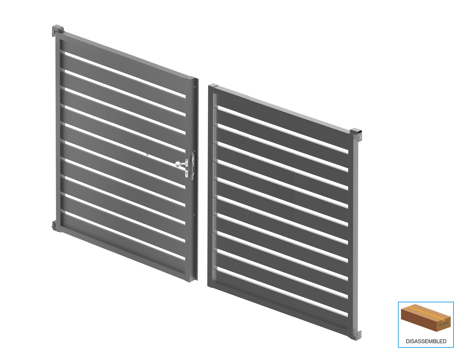A 3,92 x 1,85 m méretű kétszárnyú alumínium kapu modern és elegáns megoldás az Ön otthonában. A kapulap 20 x 100 mm-es lécekből áll, amelyeket 20 mm-es rések választanak el egymástól, így biztosítva az egyensúlyt a magánélet és a fény bejutása között. Ez a kialakítás elegáns megjelenést biztosít és fenntartja a nyitott légkört, ami különösen fontos a családi házakban és kertekben.