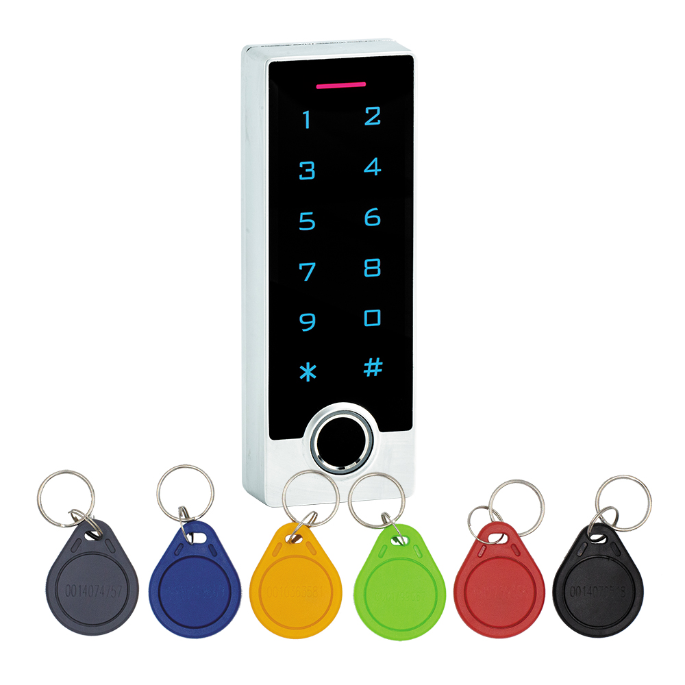 CONTROL vandálbiztos, kültéri, önálló működésű, ujjlenyomatolvasós, RFID (125kHz EM) proximity kártyaolvasó és kódzár, 10000 kód / 600 ujjlenyomat kapacitás, NO/NC relés kimenet, LED háttérvilágítás, 12/24Vdc, falon kívüli keskeny kivitel, 6db CON-TAG RFID kulcstartóval