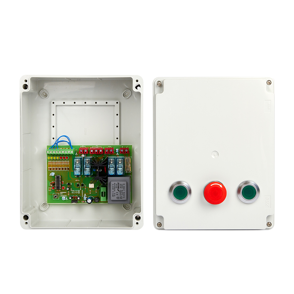 Egymotoros vezérlés 230VAC tengelyvég motorokhoz. Max. 2KW, nyit, zár PP, fotocella, stop és végállás bemenetek, auto. visszazárás, indítókondenzátor kezelés, DEAD MAN funkció, külön fel és külön le irány, félautomata, és automata funkció, 24V segédkimenet. Dobozolt, nyomógombokkal.