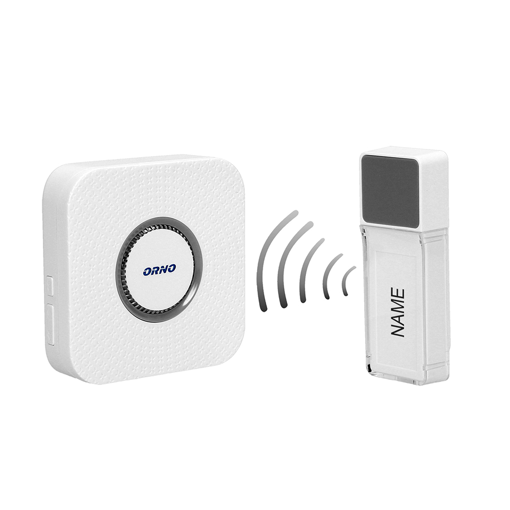 ORNO – vezeték nélküli kapucsengő, DC elemes kivitel, 433MHz, 58 hang, fehér színű, állítható hangerő, max 110dB, max 400 méter hatótávolság, beltéri egység 80x80x25mm, kültéri nyomógomb 30x85x18mm, további OR-DB-FX-152PD kültéri nyomógombbal bővíthető