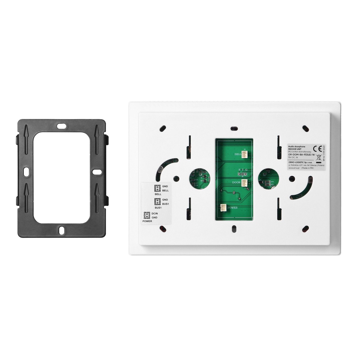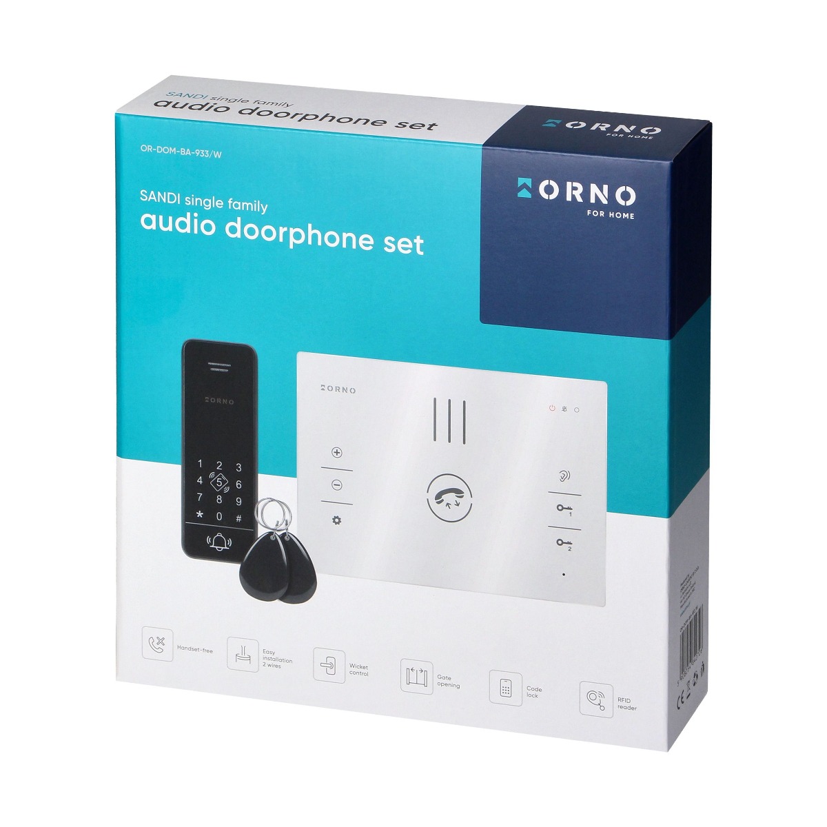 ORNO – 2 vezetékes, 1 lakásos, kihangosítós kaputelefon szett, falon kívüli vandálbiztos kültéri egység, elektromos zár vezérlése, 13,56MHz Mifare RFID olvasó, numerikus kódzár funkció, 2db CON-TAF.MF Mifare kulcstartóval, beltéri egység méretei: 180x130x26mm, kültéri egység méreti: 48x133x22mm