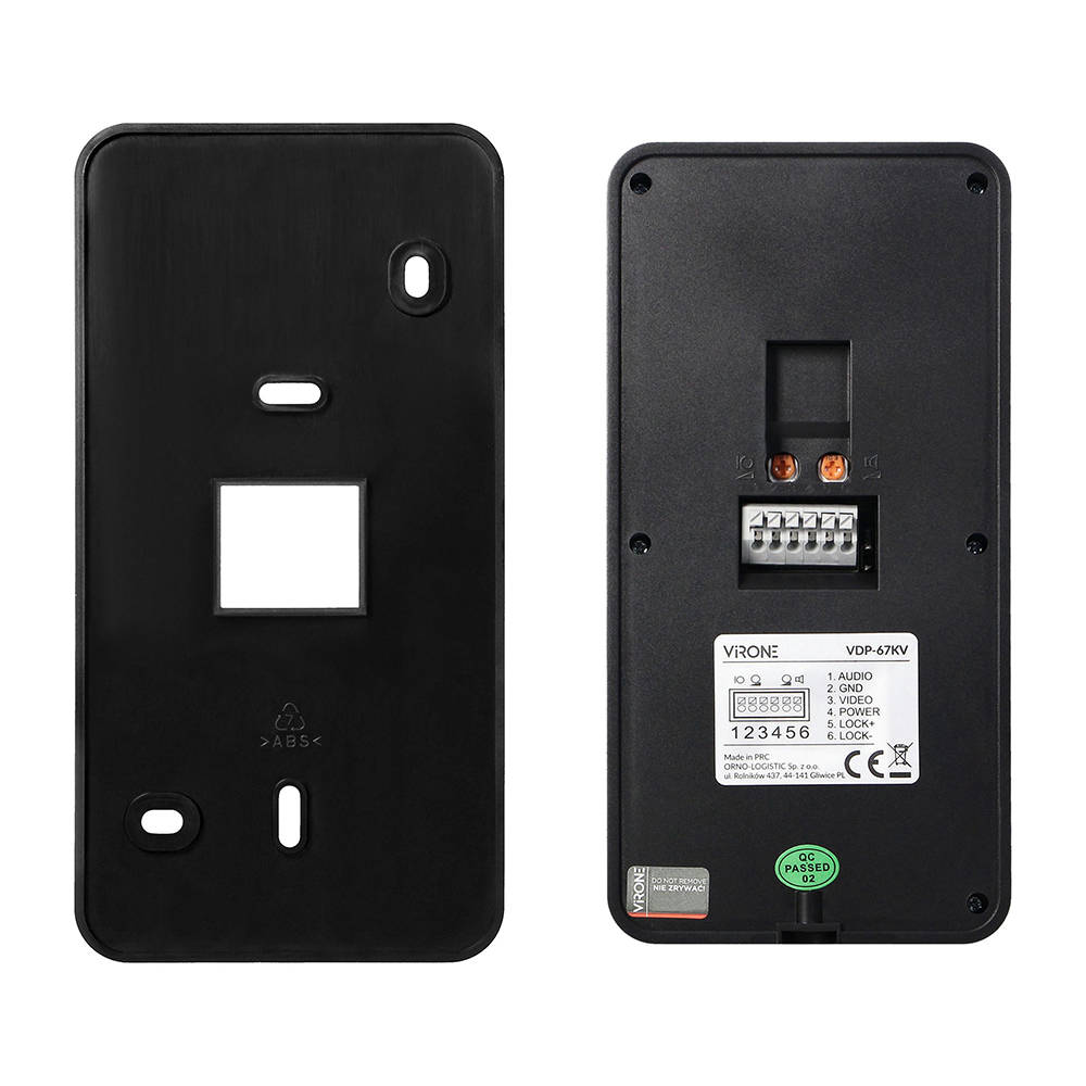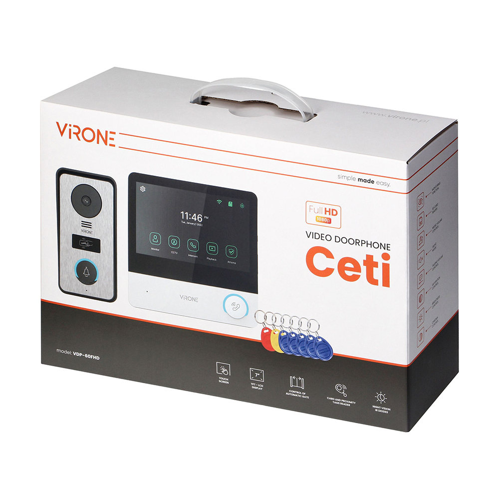 VIRONE – 4 vezetékes, 1 lakásos videokaputelefon szett, falon kívüli vandálbiztos kültéri egység esővédő kerettel, 7″ Full HD érintőképernyős beltéri monitor, elektromos zár vezérlése, beépített 125kHz RFID olvasó, rögzítéshez microSD kártya foglalat, 6db CON-TAG kulcstartóval, kültéri egység méretei: 87x168x40mm, beltéri egység méretei: 181x181x18mm, maximum 4db beltéri egységig bővíthető, intercom funkció,