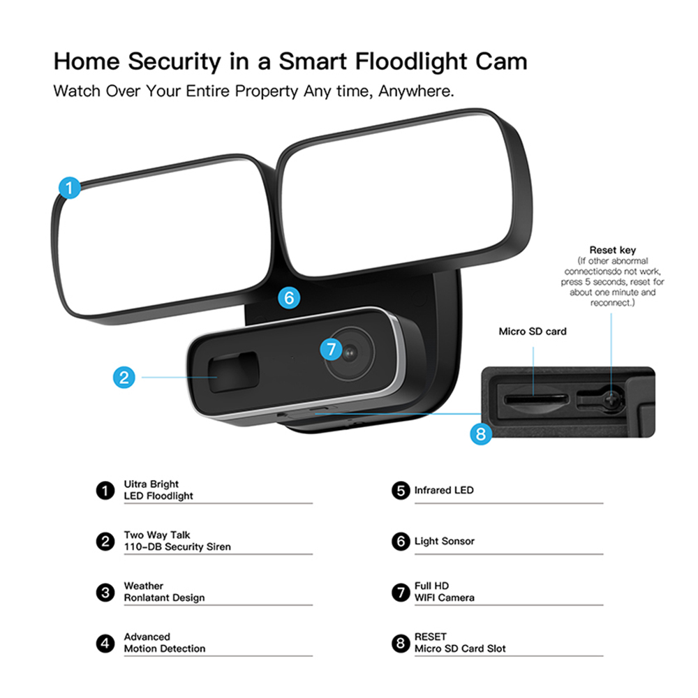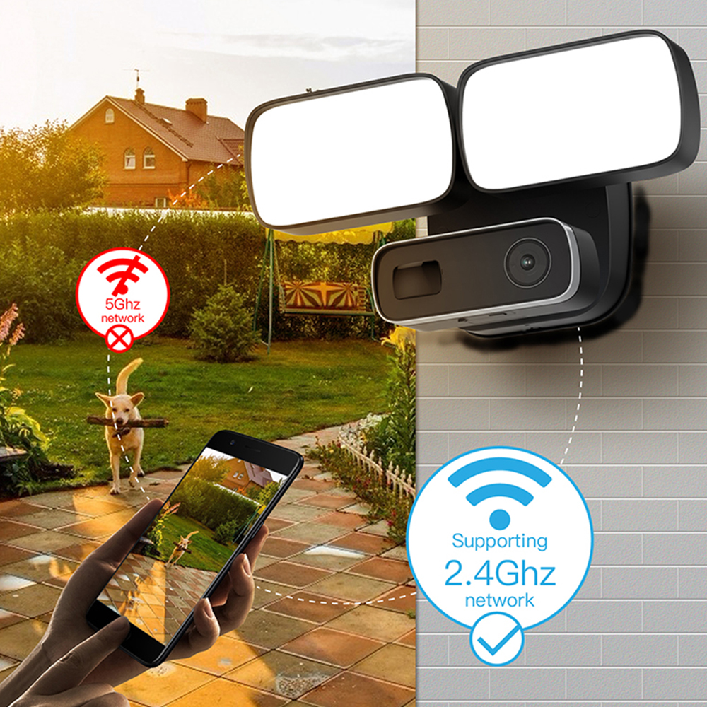 CONTROL – Kültéri Full HD Wi-Fi kamera – riasztó – LED reflektor. Mobiltelefonos vezérlés és rögzítés, külső rögzítés (SD kártya hely), 120°látószögű mozgásérzékelő, 120°látószög, 2 irányú audio, 2x11W LED reflektor (120°, 3000K, 1800lumen), 110dB sziréna riasztáshoz, alumínium ház, CE, Rohs, FCC, 230Vac